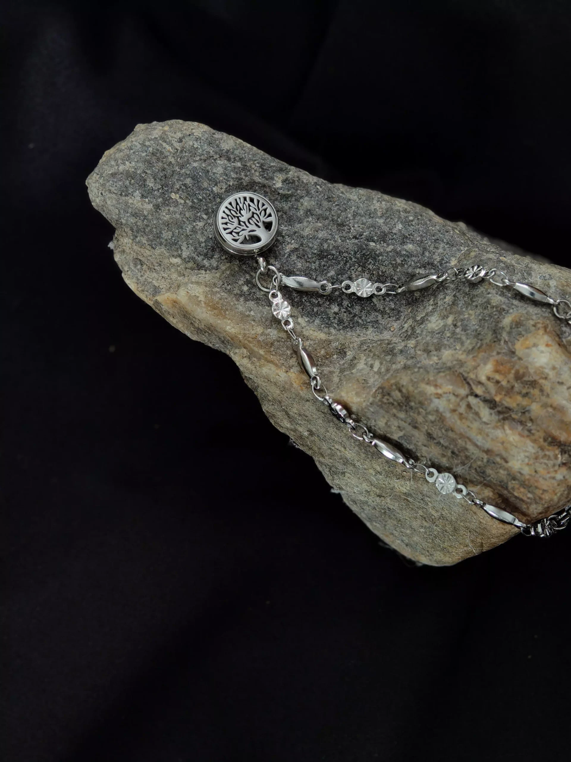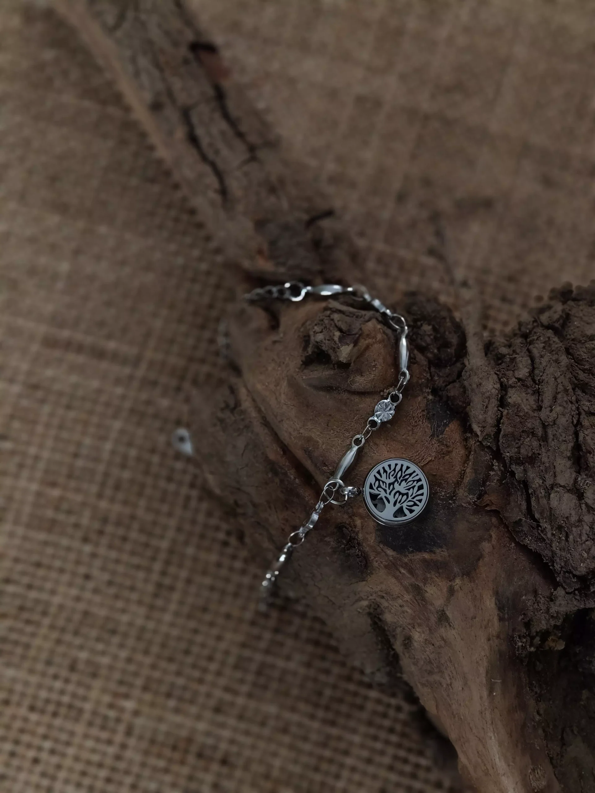 Model Drzewo Życia to bransoletka aromaterapeutyczna w kolorze srebra, łącząca elegancką formę z symbolicznym wzorem. Ażurowy medalion o średnicy 12 mm przedstawia motyw drzewa – znak siły, stabilności i zakorzenienia.