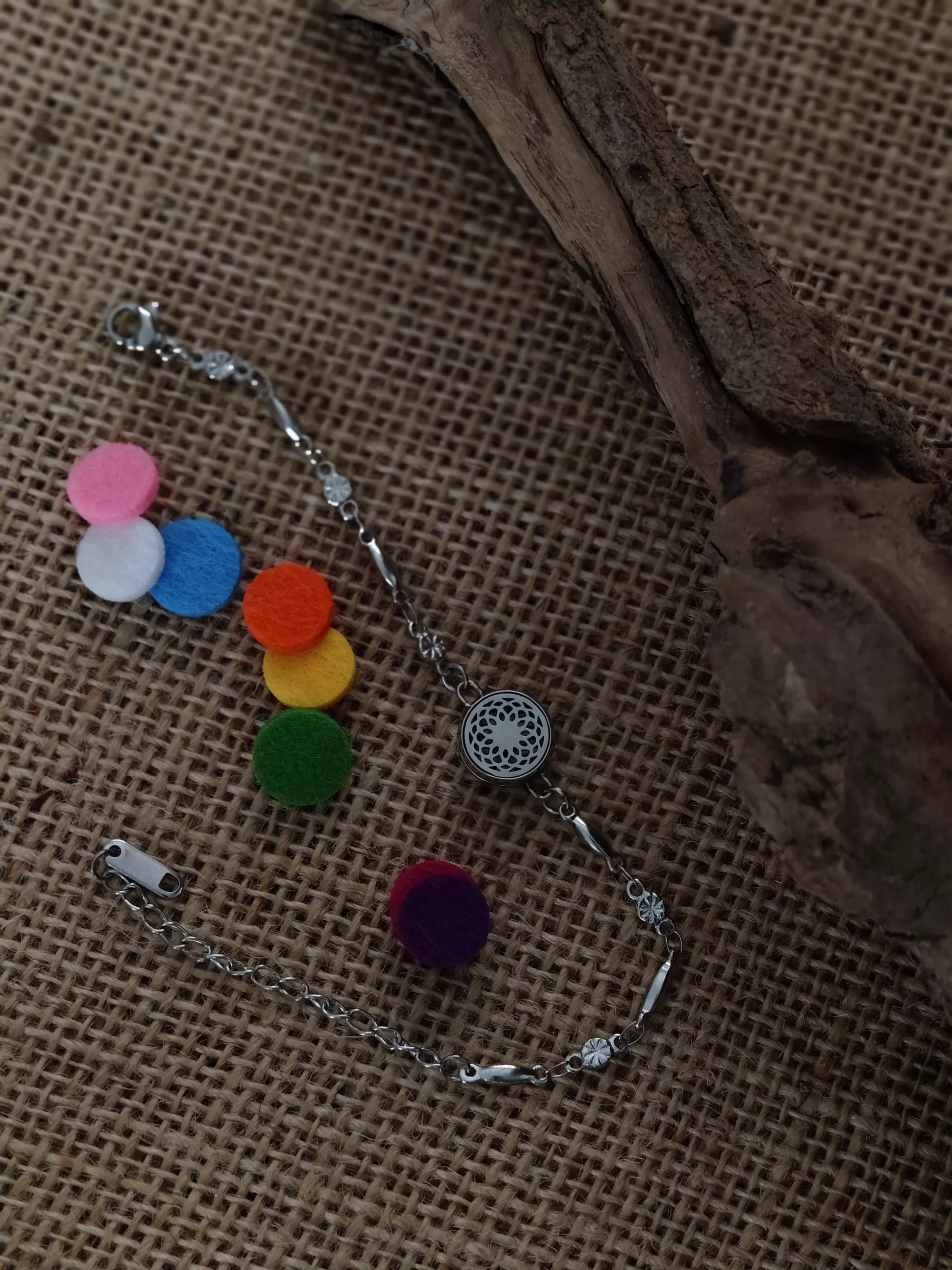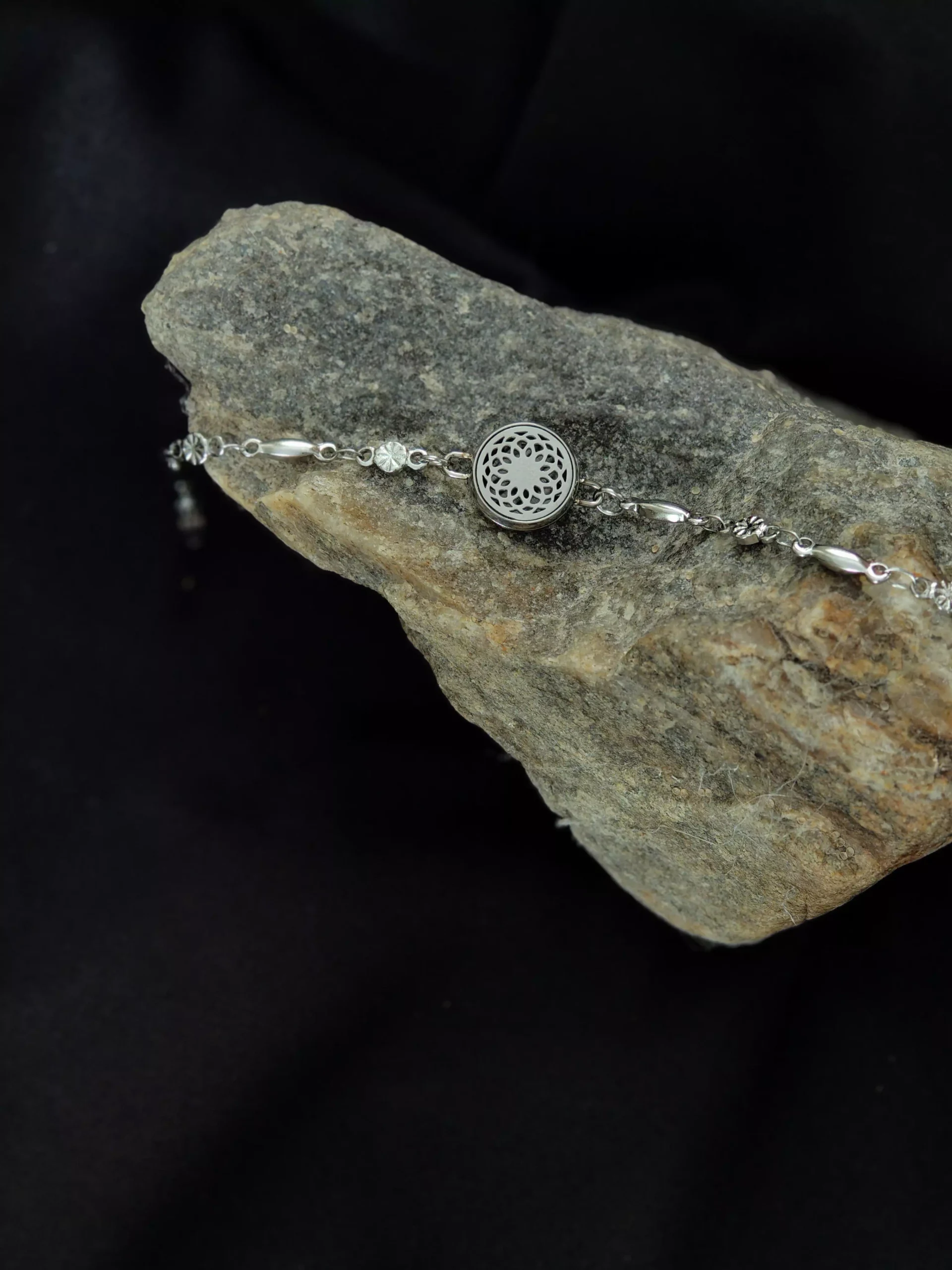 Delikatna bransoletka z ażurowym medalionem (12 mm), która pozwala mieć przy sobie ulubiony olejek eteryczny przez cały dzień.