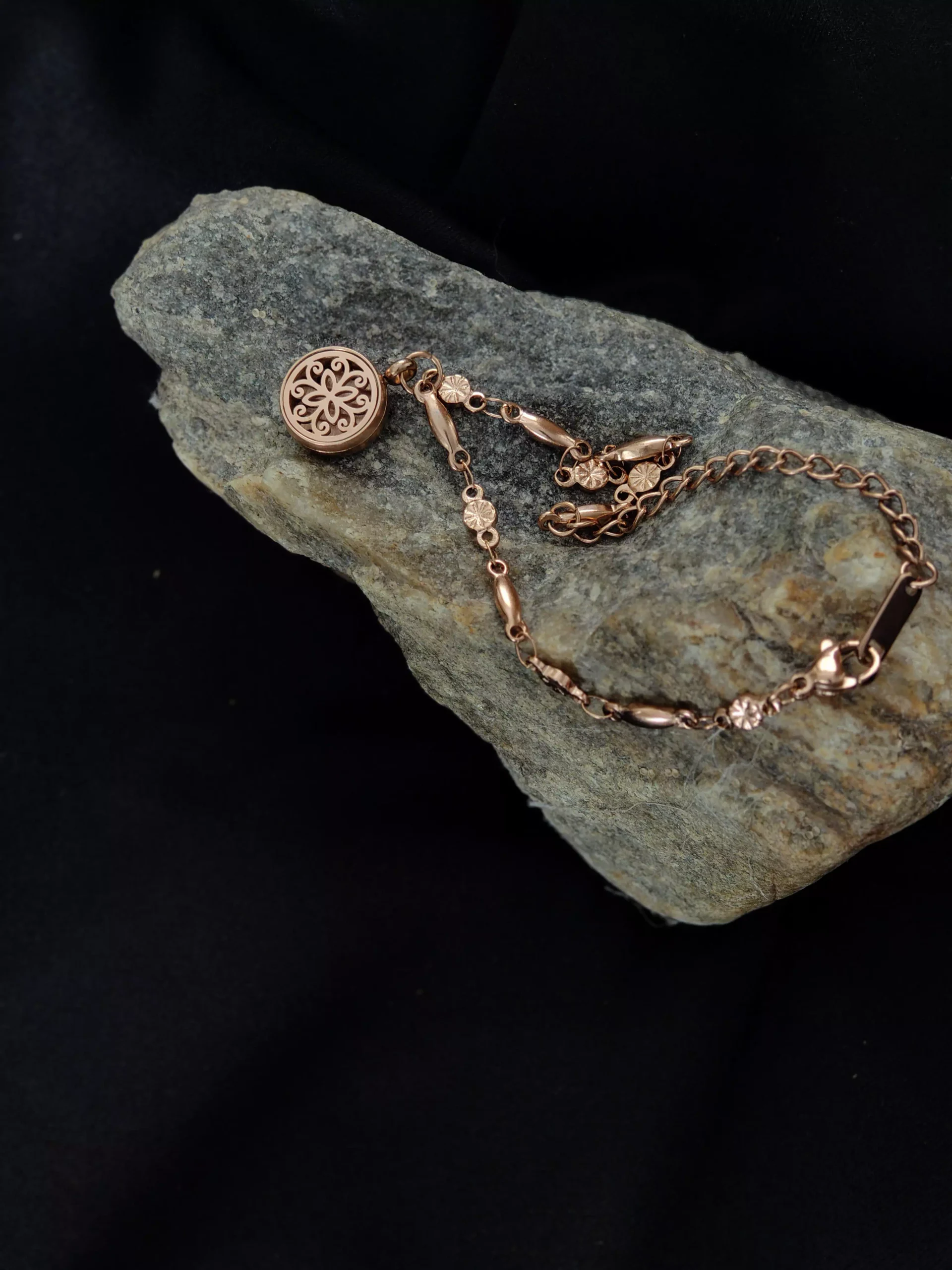 Model Tchnienie to delikatna bransoletka aromaterapeutyczna w kolorze różowego złota, łącząca lekkość formy z eleganckim detalem. Ozdobny łańcuszek i niewielki medalion o średnicy 12 mm tworzą subtelną, kobiecą kompozycję.