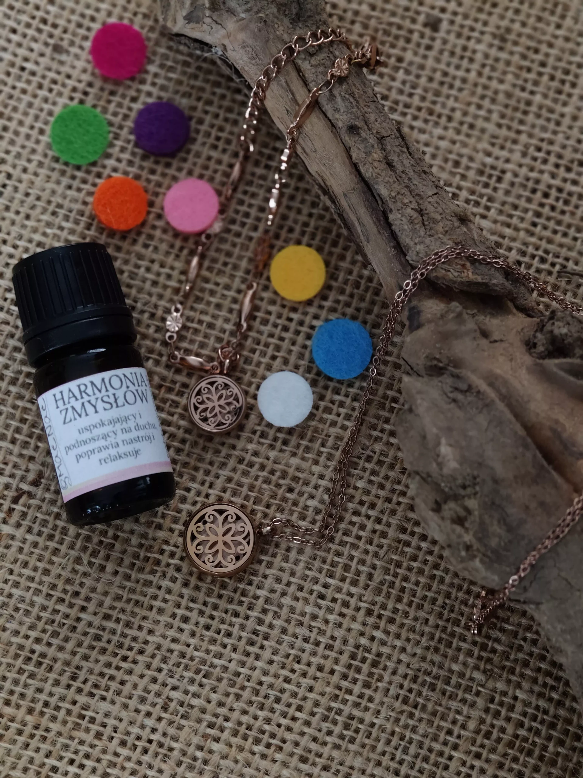 Ażurowy ornament nadaje biżuterii wrażenie lekkości i ruchu. Wewnątrz medalionu znajduje się filcowa wkładka, którą można nasączyć kilkoma kroplami ulubionego olejku eterycznego. Zapach stopniowo uwalnia się przez wzór, pozostając blisko skóry przez wiele godzin.