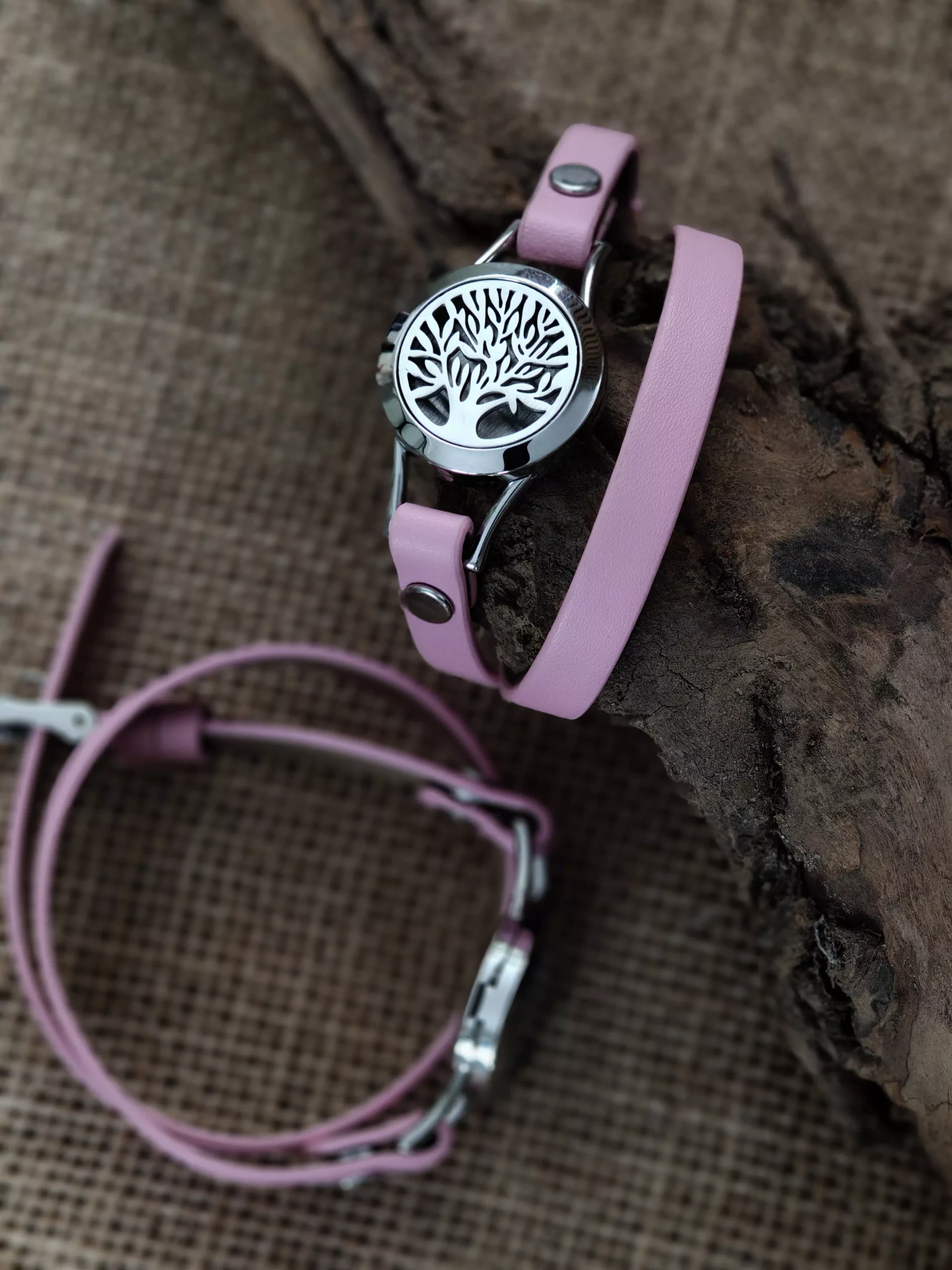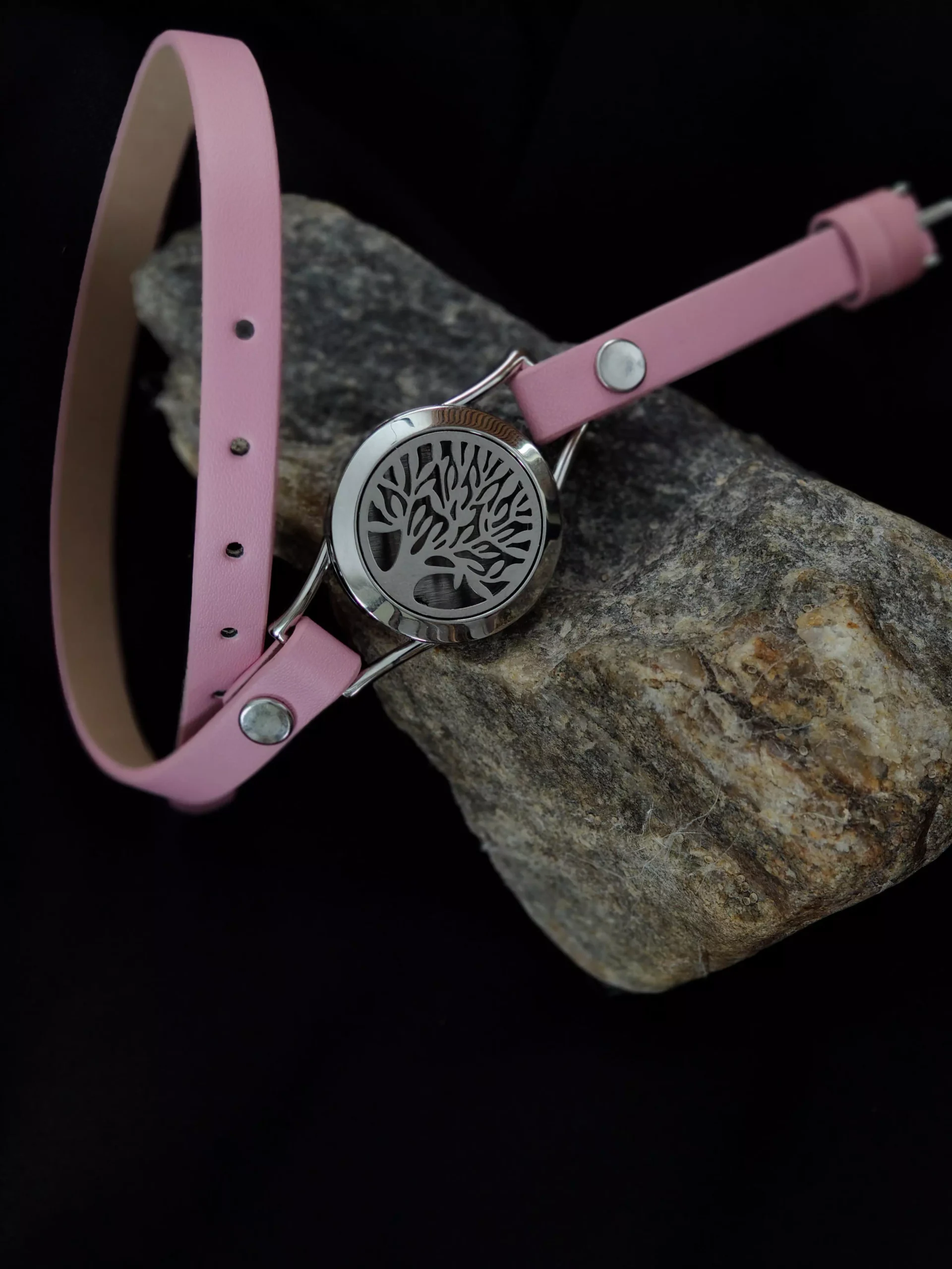 Bransoletka aromaterapeutyczna z medalionem (25 mm) z motywem Drzewa Życia na opasce z ekoskóry, dostępna w kolorze różowym lub czarnym.