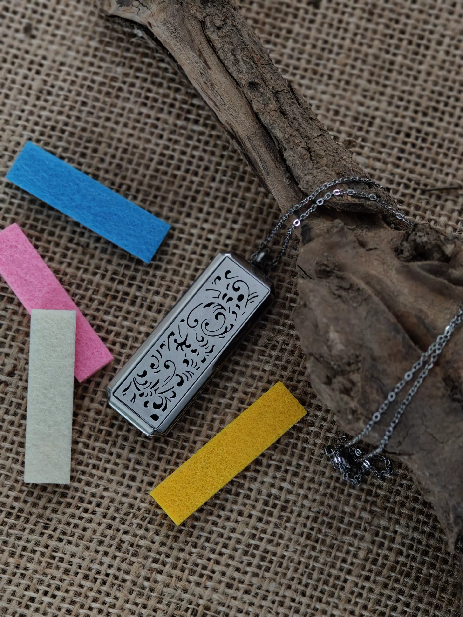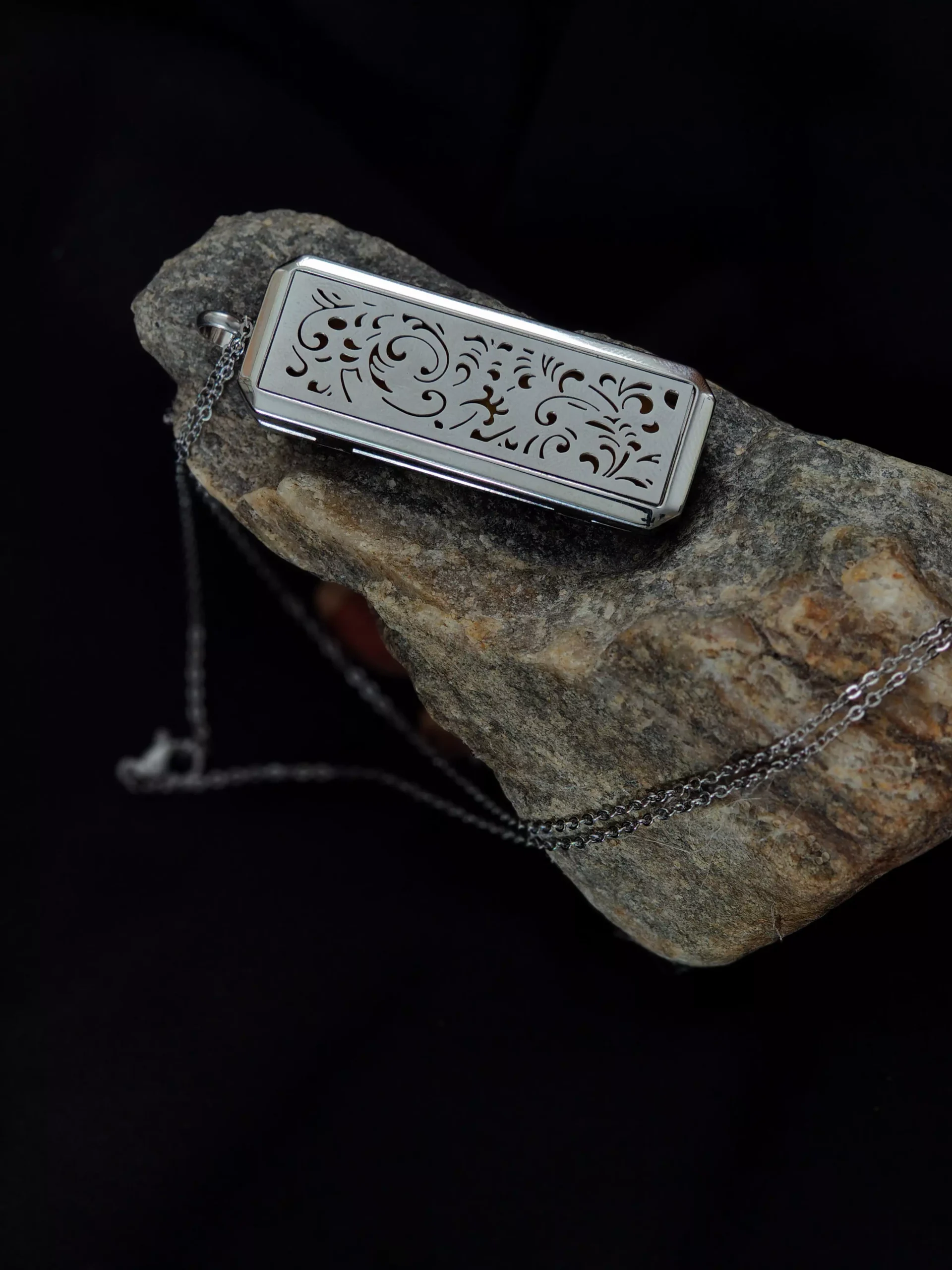 Srebrny naszyjnik aromaterapeutyczny z podłużną zawieszką (50 × 18 mm) na łańcuszku o długości 50 cm.