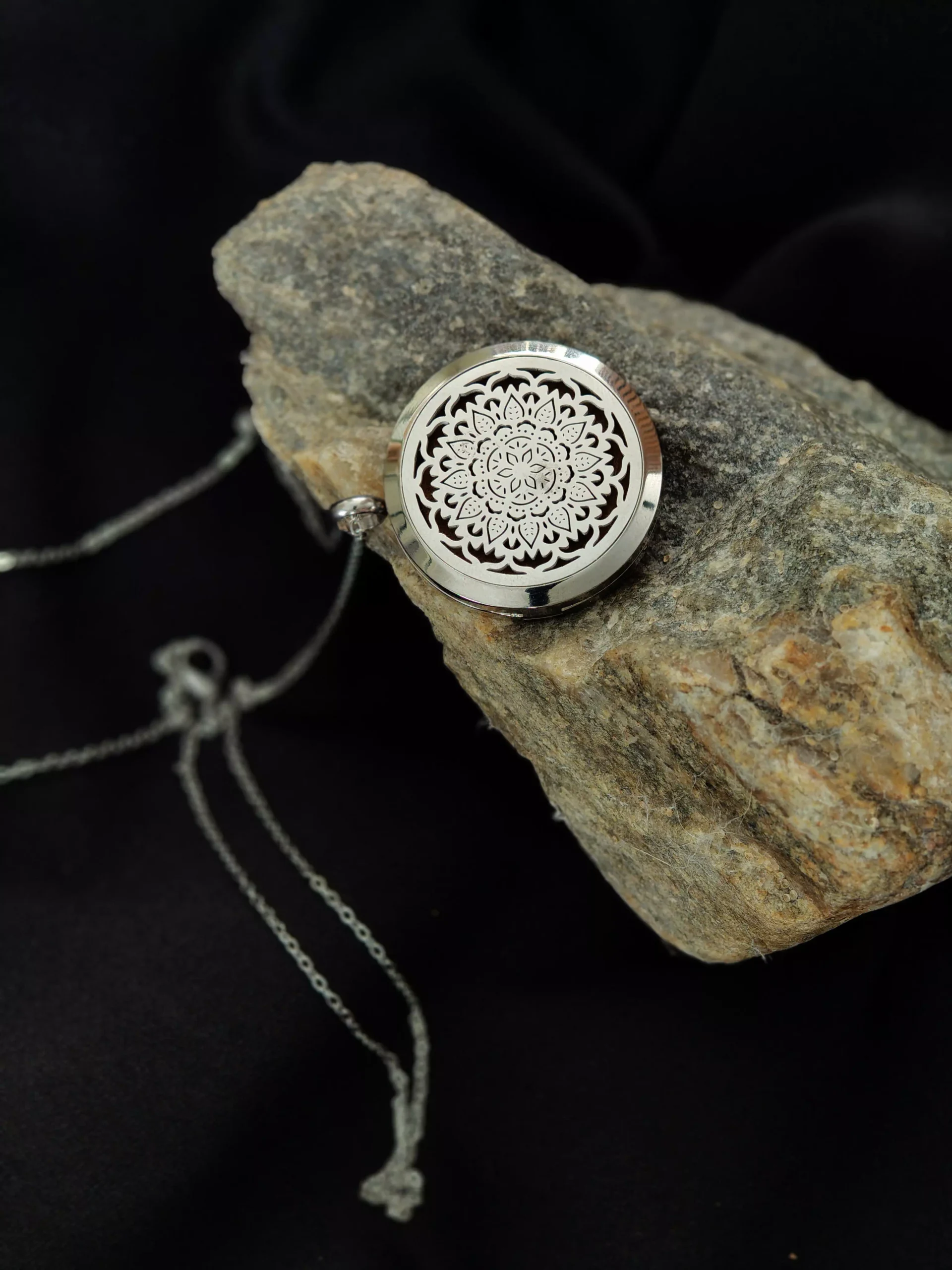Naszyjnik aromaterapeutyczny z zawieszką (30 mm) z motywem Słońca na łańcuszku o długości 50 cm.